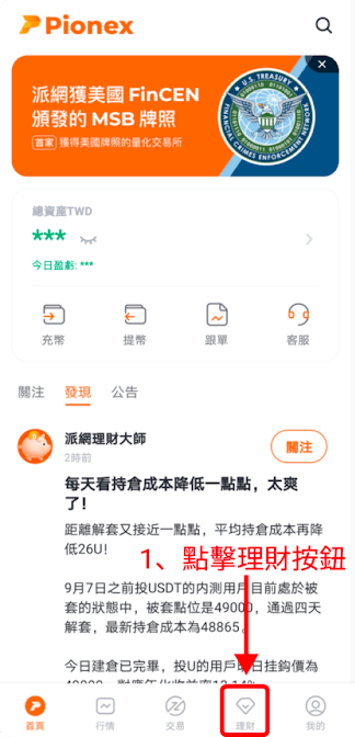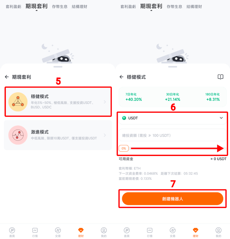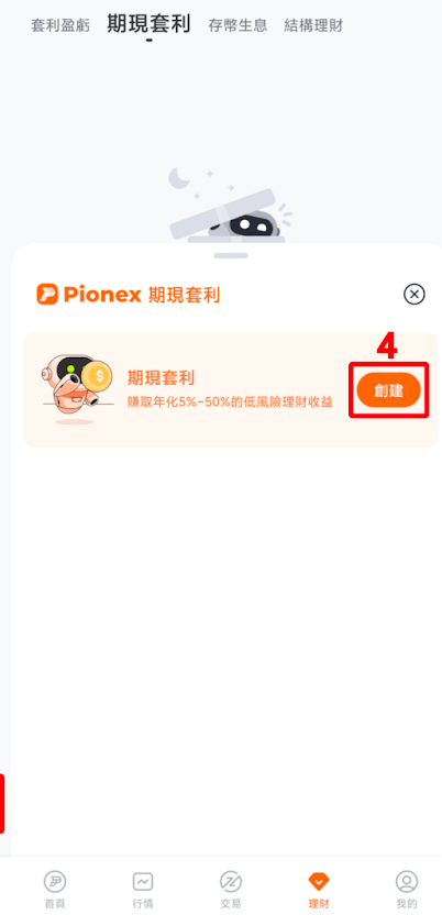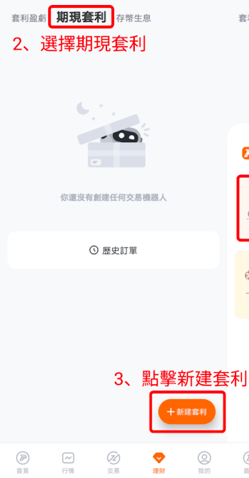 1. 點選「理財」頁面並點擊頁面上方的「期現套利」,點選右下角的「新建套利」按鈕
