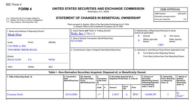 在 2020 年 4 月的時候,Elon Musk 就有填 Form 4 內部人持股變動書。