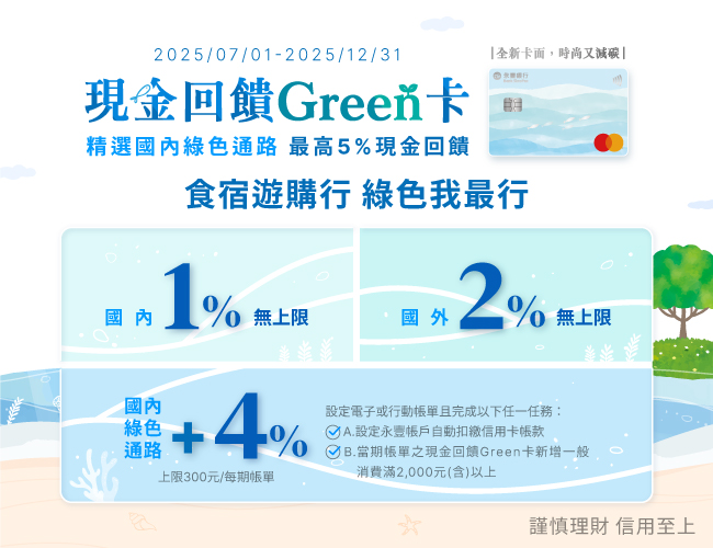 永豐 Green 卡 | 4% | 加碼4%,300/月(自動加值 7500) | 活動期間:-2025/12/31 綠色消費加碼 4%,需申辦電子化帳單完成 + 當期一般消費滿 2000 元 ➡️ 申辦永豐 Green 卡 |