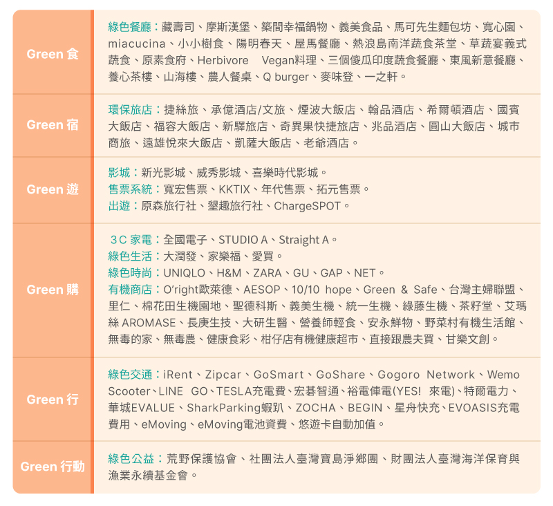 - 有機綠活:里仁、義美食品、聖德科斯、台灣主婦聯盟、棉花田、馬可先生麵包坊、健康食彩、永豐餘生技、安永鮮物、無毒農、天和鮮物、柑仔店、有機緣地。