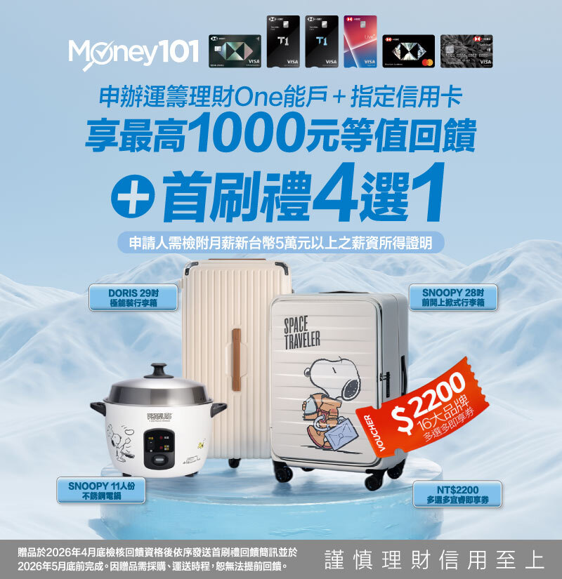 *贈品序號於2026年3月檢核回饋資後依序發送首刷禮回饋簡訊並最遲於2026年4月底前完成簡訊通知。因贈品需採購、運送時程,恕無法提前回饋。符合資格申請人收到簡訊後最遲需於2026年6月底前點選兌換連結並登入Money101會員選擇贈品並填寫配送資料,如超過兌換截止月份底前未完成兌換,本行保留以其他等值贈品替代的權利。