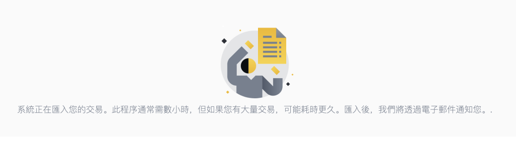 3. 接著幣安就會開始匯入你過去的交易資料,報告匯出的時間會看你過去的交易紀錄多寡,多的話時間可能會需要 4 小時以上。後續幣安會寄信通知你