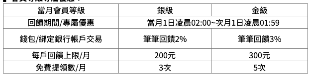 當月會員等級存續期間使用悠遊付錢包或綁定銀行帳戶扣款交易,依會員等級每筆交易享最高2%或3%悠遊付回饋金,並享免費提領次數3或5次。