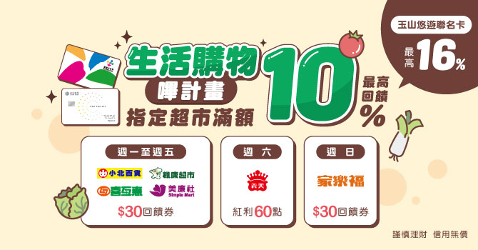 | 楓康超市 | 週一至週五 | 持悠遊卡/悠遊聯名卡,單筆消費滿300元(含)以上,享悠遊付楓康30元現金回饋券一份,單筆不累贈,每悠遊付會員回饋上限300元,優惠總限量6,000份,送完為止 | 持玉山悠遊聯名卡,單筆消費滿300元(含)以上,享悠遊付楓康20元現金回饋券一份,單筆不累贈,每悠遊付會員回饋上限200元,優惠總限量6,000份,送完為止 | |