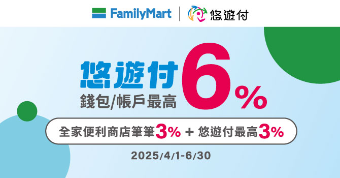 2.活動內容:活動期間使用悠遊付錢包/綁定銀行帳戶於全家便利商店店鋪消費,每筆扣款享3%悠遊付回饋金,每月每戶回饋上限1,000元。活動期間同享「悠遊付月級挑戰錢包/綁定銀行帳戶最高回饋3%」活動回饋疊加優惠最高享6%悠遊付回饋金。