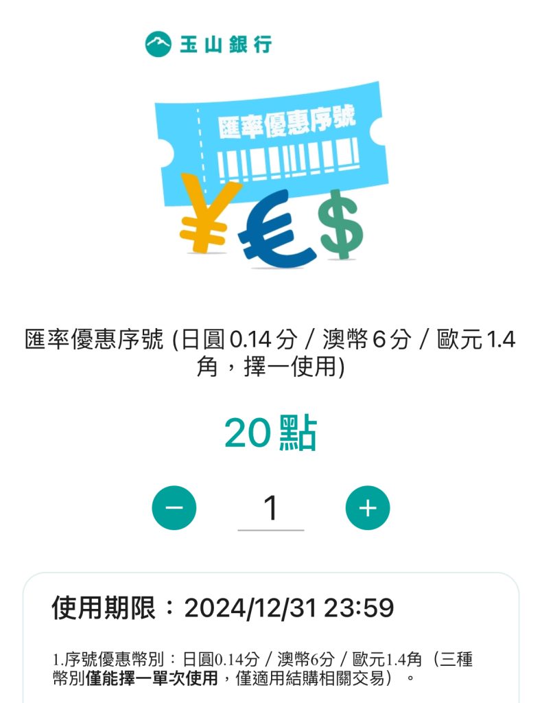 目前這「匯率優惠序號」可以用 20 點兌換,使用序號(每次兌換限使用一次),可以獲得以下優惠: