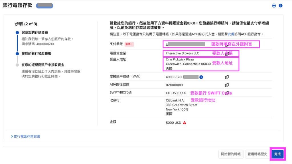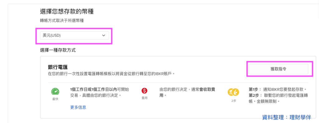 IB 提供多種入金方式(如 Wise、ACH),但對於身在台灣的投資人來說,「銀行電匯 (Bank Wire)」 依然是最穩健、額度限制最少,且最不容易出錯的方式。