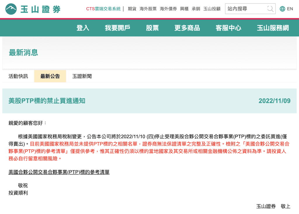 所以在此規定公告後,許多國內券商在 2022 年底之前就已經停止受理委託買進 PTP 相關標的。而如果是自行在美股券商開戶,則要在投資前確認是否是 PTP 標的喔!