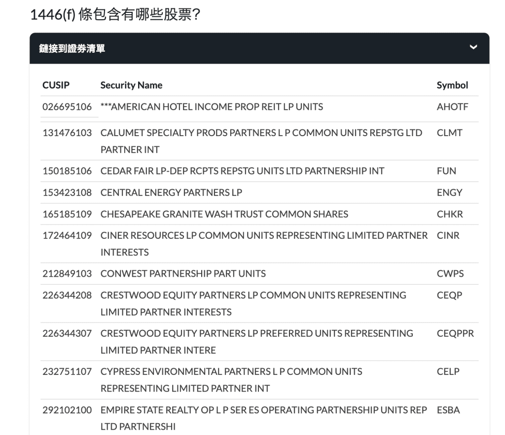 另外,許多券商也會整理出受到 1446(f) 這項規定影響到的 PTP 公司、ETF,在交易之前都可以查看確認。