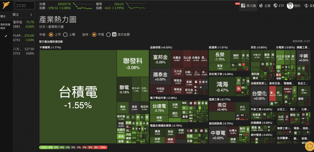 依產業、市值、成交金額繪製,一眼看清今日漲跌!免費註冊富果帳戶,就可以查看這個熱力圖。