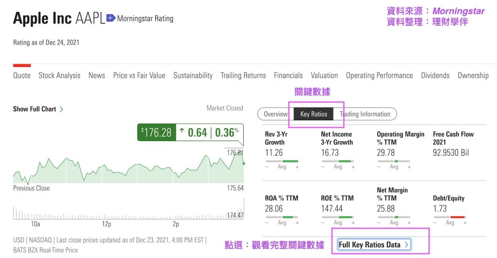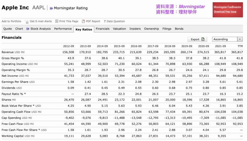 舉蘋果為例,在晨星網站中輸入股票代號 AAPL 後,點選 Key Ratios (關鍵財報數據)就可以看到像是自由現金流、ROA、ROE 等數據。如果點選下方的 Full Key Ratios Data ,就可以看到蘋果十年內的完整財報數據了!