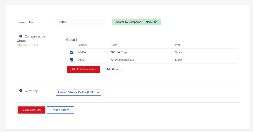 如果你已經很清楚你要比較哪些股票、ETFs,可以直接搜尋公司名稱或股票代號進行比較,如果要長期觀察的話,甚至可以加成群組喔!