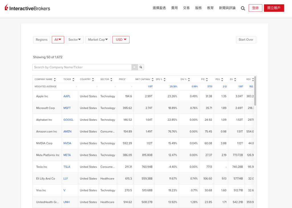 - 篩選比較股票、ETFs: IBKR 全球股票分析器