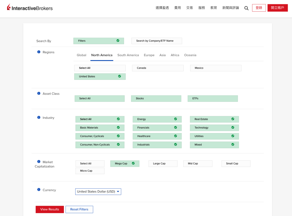 - Regions 地區:選擇地區後可以進一步選擇國家,因為 IBKR 支援投資全球市場,所以搜尋範圍並不僅限於美股