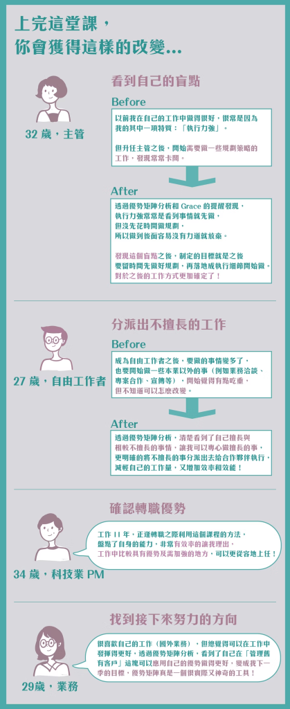 只要是現在工作裡面感覺有一點點卡卡的,想要找到自己的優勢、對自己更有自信的人,都很適合來上課堂課喔!